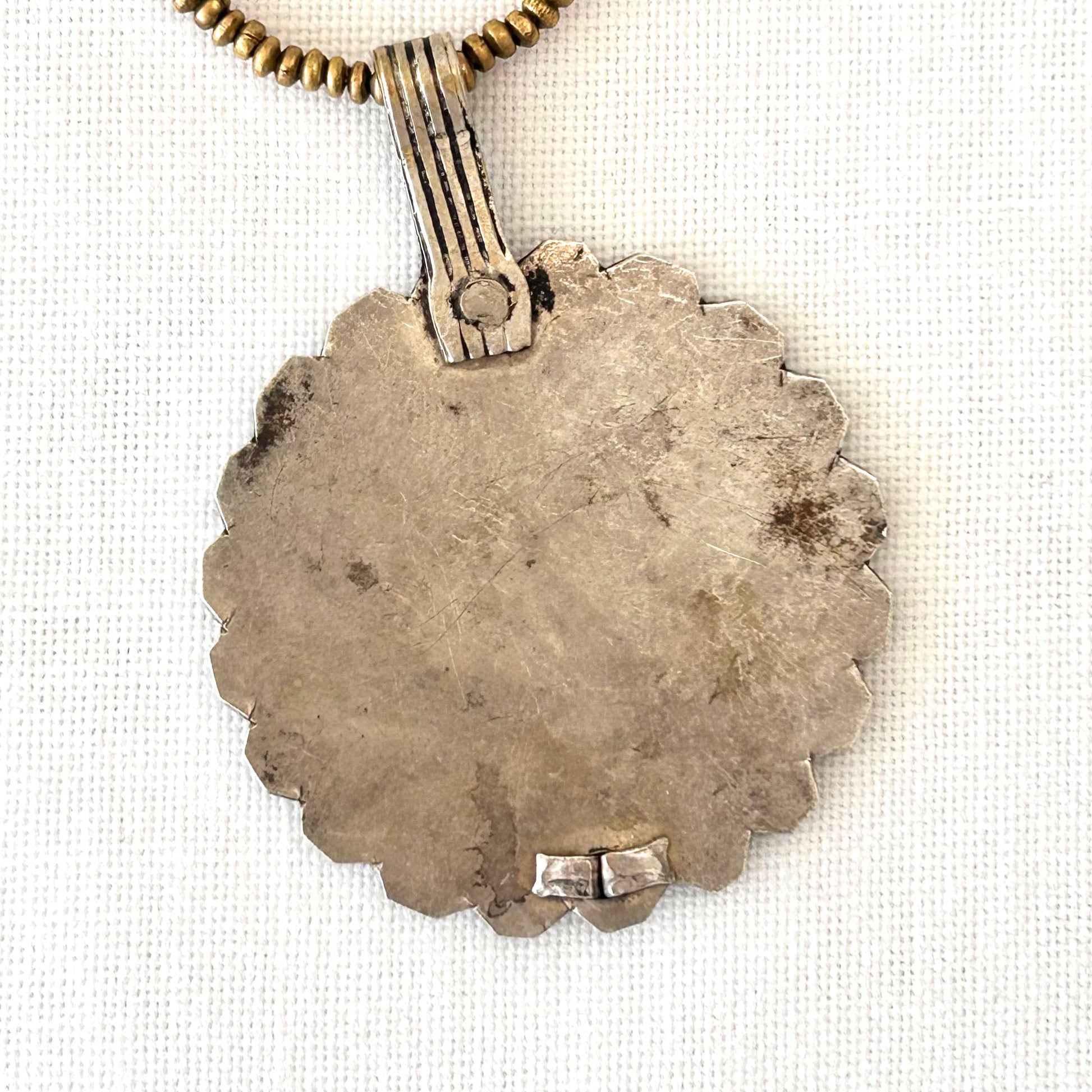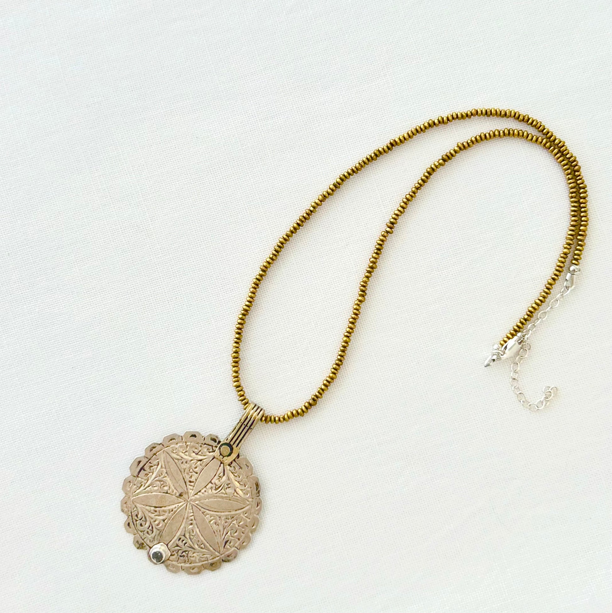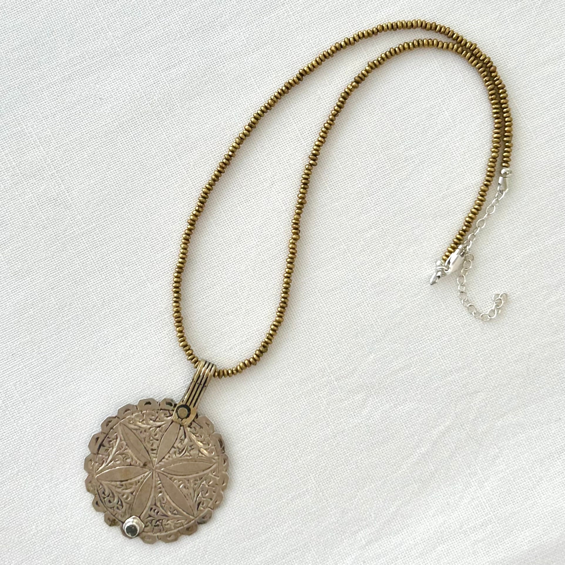Necklace made with brass tiny beads and silver findings with a gorgeous old silver berber pendant from Morocco, approx. early 20th century. The pendant is 4cm and the bail 1.5cm. A very special combination.